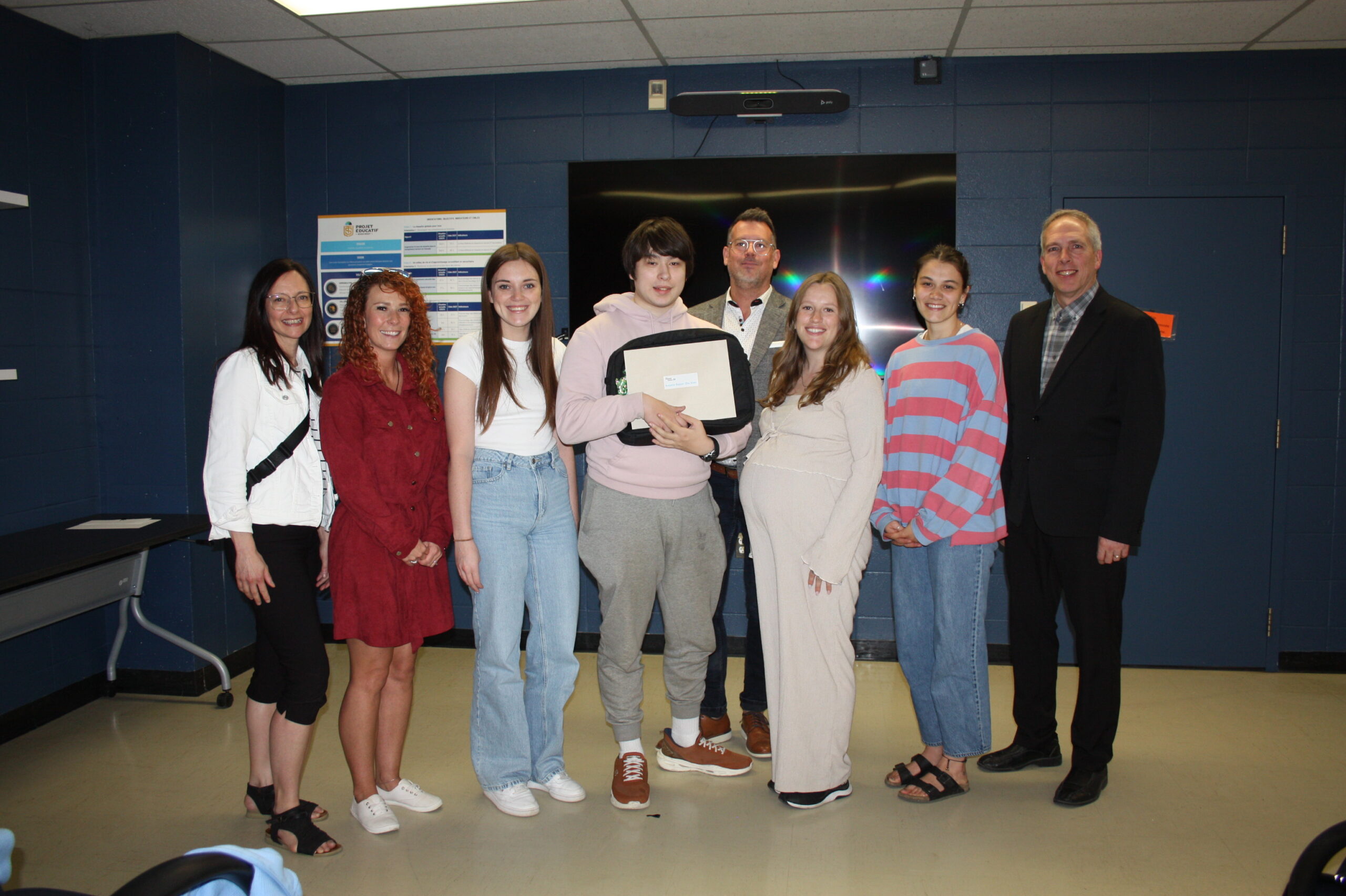 Photo de groupe en entête, dans l’ordre habituel : Nancy Mathieu (technicienne en éducation spécialisée qui a travaillé avec Antoine) Audrey Caron (intervenante pour le CIUSSE) Rebecca Hayes (technicienne en éducation spécialisée au local Zen) Antoine Bojean Zhu Noël (élève méritant) Tommy Poulin (directeur de la polyvalente) Anna Sturdy-White (technicienne en éducation spécialisée) Maude Maltais (technicienne en éducation spécialisée) Martial Gaudreau (directeur général CSSHC)