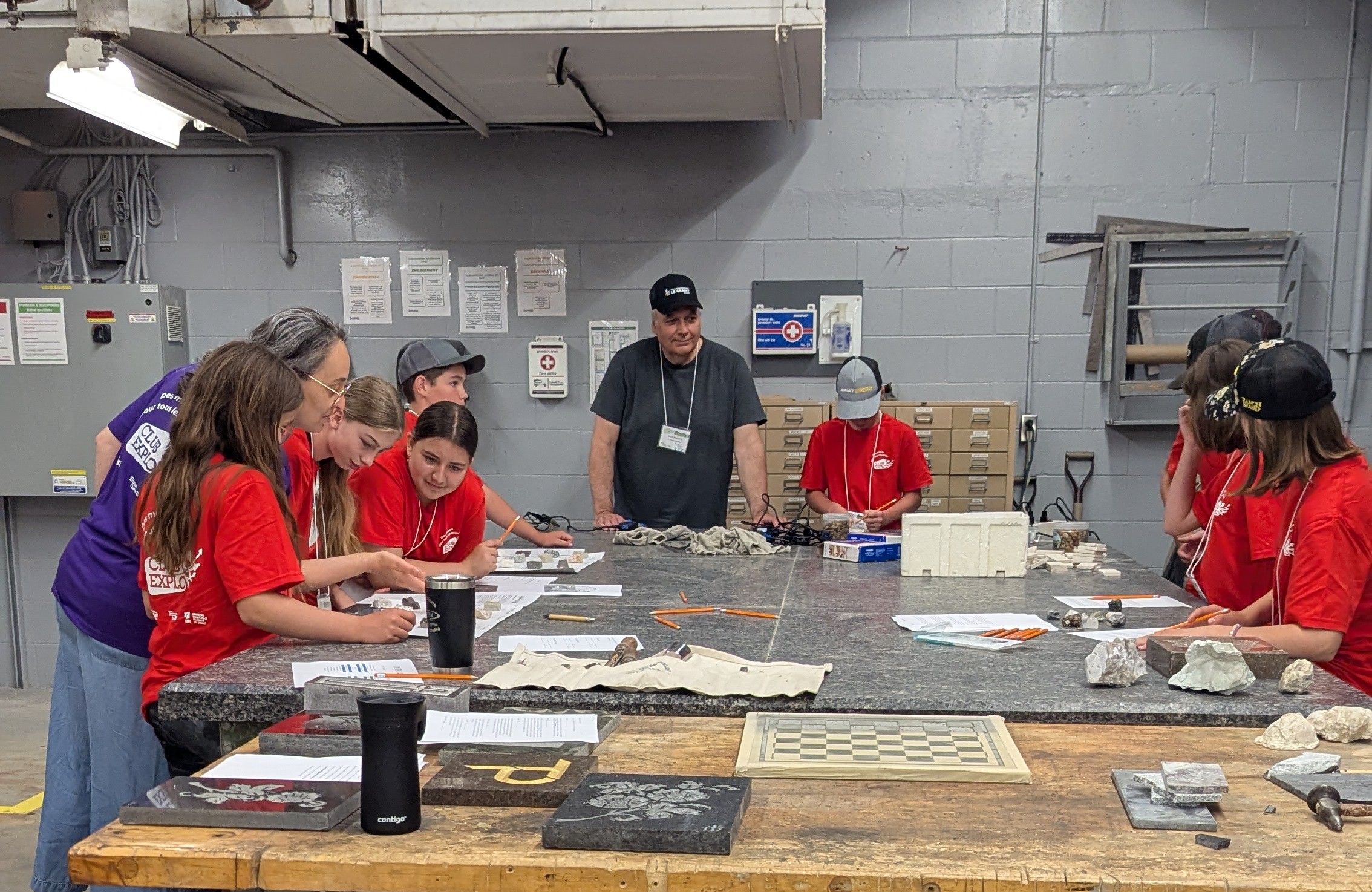 Photo d’en-tête : Les adultes accompagnateurs Rachel Gendron et Jean Ménard en compagnie des élèves du groupe D : Rémy Fillion, Amilia Gagnon, Camille Côté, Emy Robinson, Léa Boulanger, Rayan Grondin, Élly-Anne Gilbeau, Michaël Gosselin et Emryck Lecours lors de l’atelier Taille de pierre.
