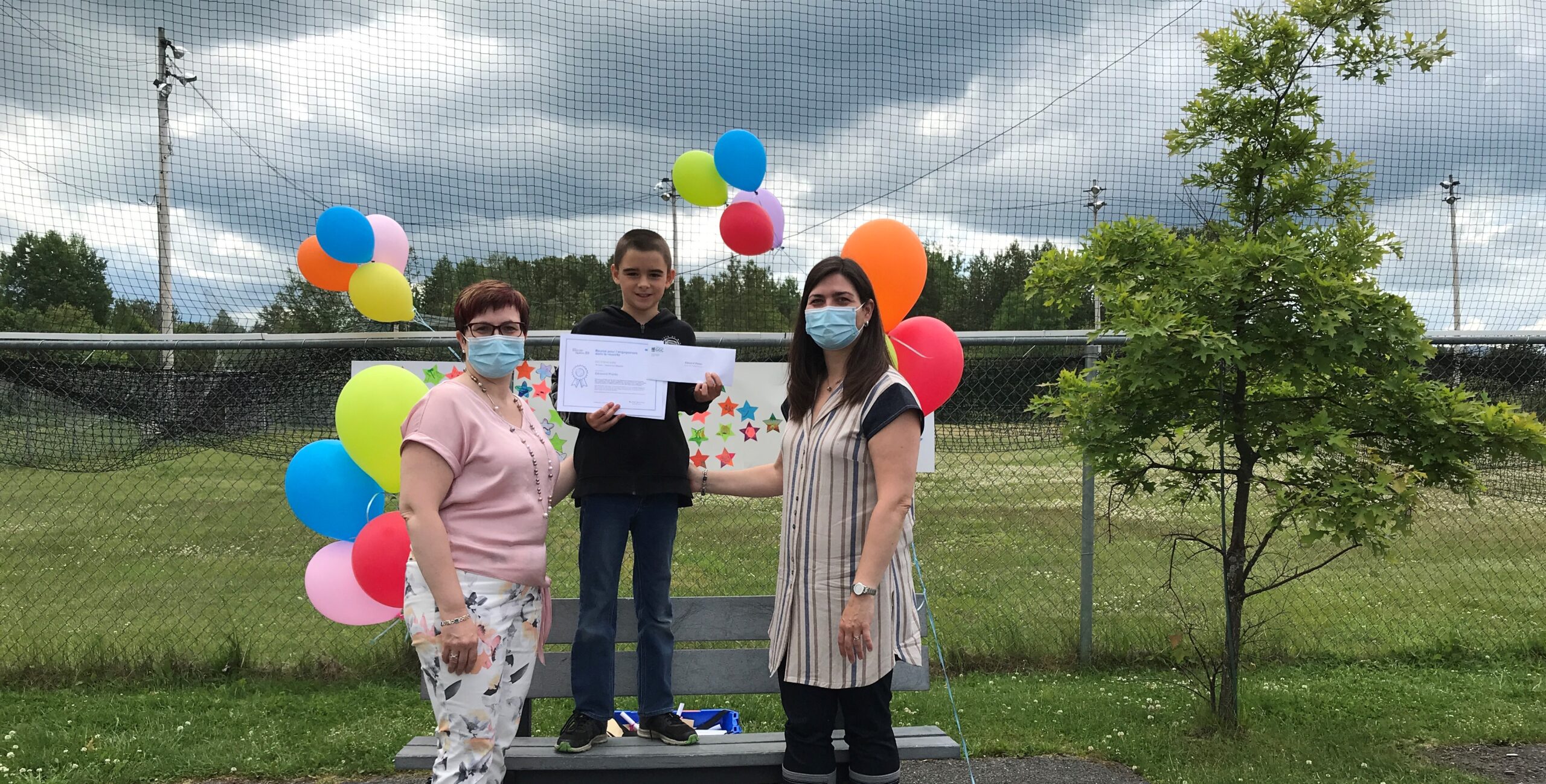 l’ordre habituel : Renelle Roy, enseignante, Edouard Plante, élève méritant et Geneviève Foley, directrice.