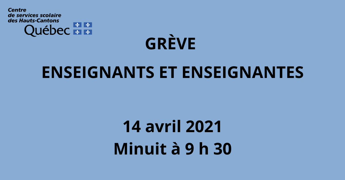 Tel qu’annoncé lors de notre communication du 7 avril 2021, une grève des enseignants est prévue le mercredi 14 avril prochain de minuit à 9 h 30 le matin. Puisque la Cour supérieure a rejeté la demande de contestation des centres de services scolaires du Québec quant à cet avis de grève, celui-ci sera maintenu. Nous vous retournons donc les précisions quant au déroulement de la journée du mercredi 14 avril 2021 :