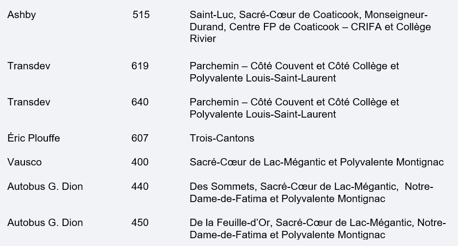 Comme vous l’avez probablement entendu dans les médias, les autobus électriques Lion font l’objet d’un retrait préventif. Au sein du CSSHC, 7 circuits sont visés, soit les suivants :