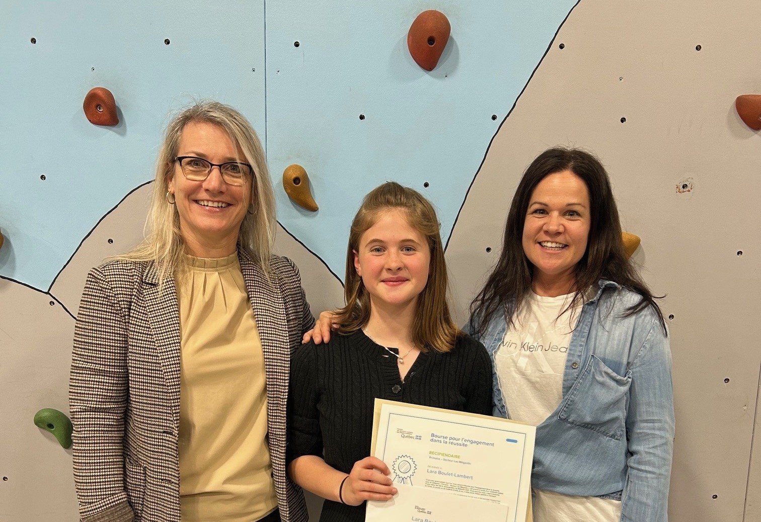 Photo dans l’ordre habituel : Stéphanie Leclerc – directrice, La récipiendaire Lara Boulet-Lambert accompagnée de son enseignante Sandra Bolduc.