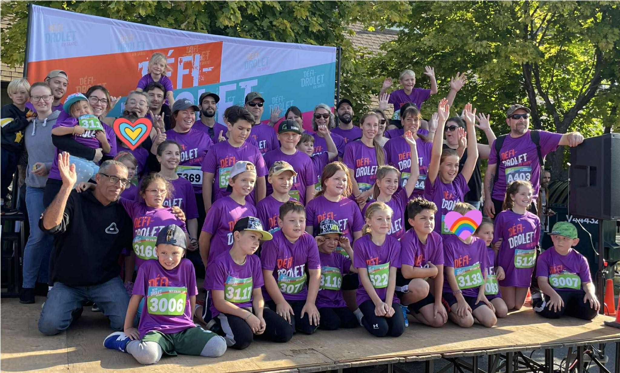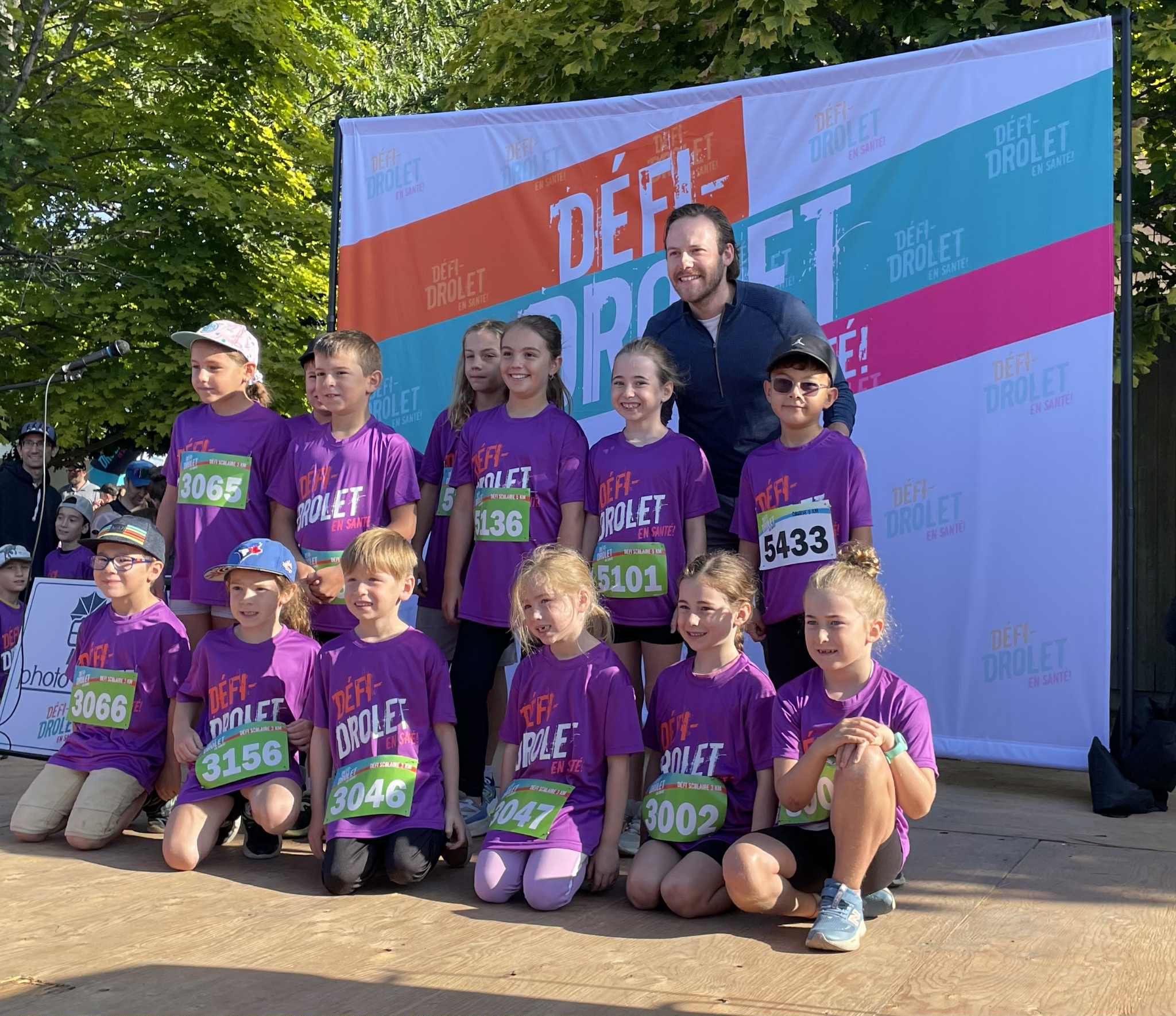 École Sacré-Coeur: double championne au chrono collectif (sur la photo on retrouve, avec les élèves, le Dr. Bernard Gélinas et Simon Couët du comité organisateur du Défi Drolet)
