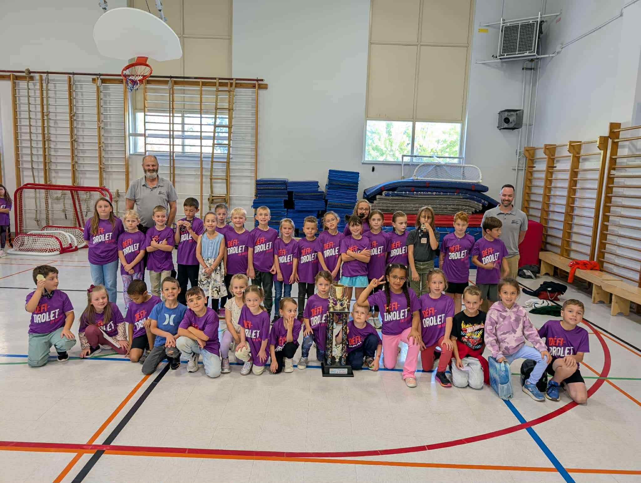 École Sacré-Cœur (avec les élèves on y retrouve, entre autres, Stéphane Routier et Nathalie Bernier: enseignants d’éducation physique et Isabelle Boulet-directrice adjointe et enseignante)