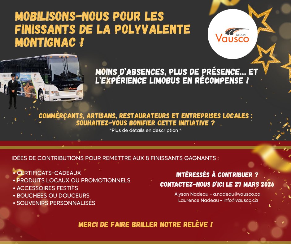 Le Groupe Vausco s’est senti interpellé et a pris l’initiative de créer un concours pour les finissants de la polyvalente. Ainsi huit élèves finissants et leurs accompagnateurs ou accompagnatrices auront la chance de gagner une expérience VIP pour leur transport jusqu’au lieu du bal dans un autocar de luxe. L’expérience sera bonifiée par des surprises et des cadeaux.