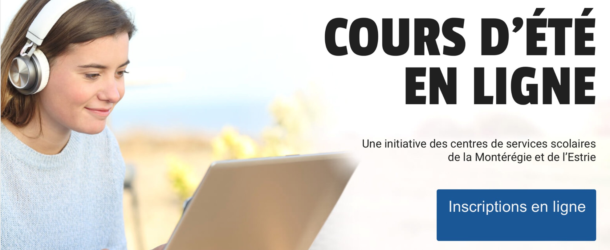 Les douze centres de services scolaires de la Montérégie et de l’Estrie se sont regroupés pour offrir conjointement des cours d’été en ligne à leurs élèves de 3e, 4e et 5e secondaire leur permettant de reprendre un cours ou de suivre un cours préalable pour la poursuite de leur parcours scolaire.