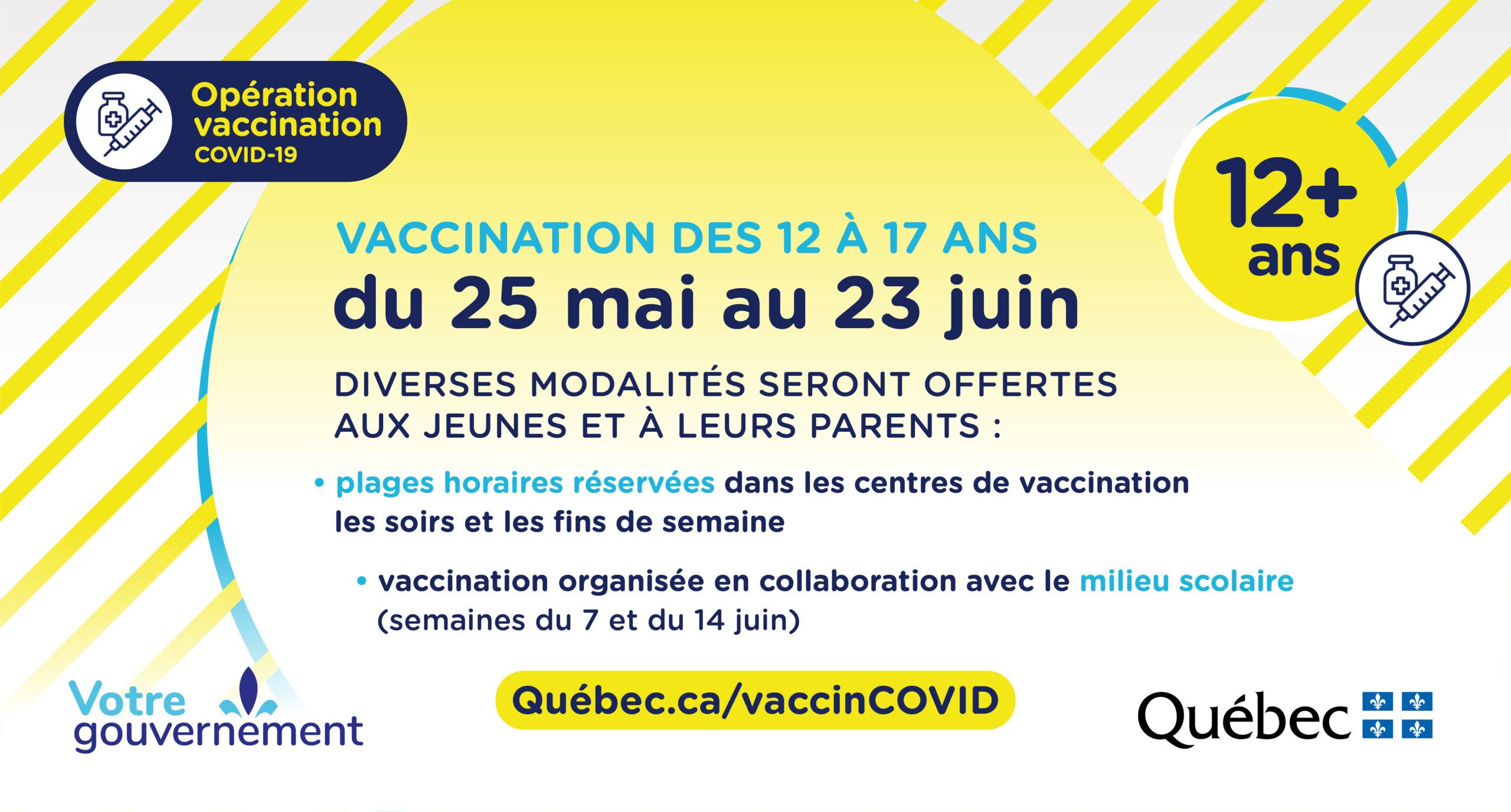 Les rendez-vous sont disponibles DÈS MAINTENANT dans Clic Santé pour la vaccination des jeunes de 12 à 17 ans!