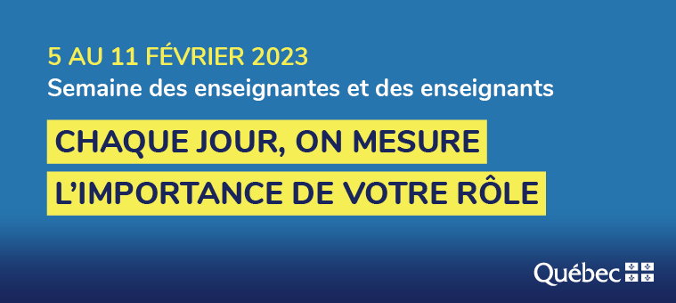 Cette semaine vise à rappeler le professionnalisme et l’importance du travail accompli par les enseignantes et les enseignants du préscolaire, du primaire, du secondaire, de la formation professionnelle et de l’éducation des adultes. La thématique de cette année « Chaque jour, on mesure l’importance de votre rôle », met en lumière tout l’impact quotidien que vous avez sur le développement de nos élèves, petits et grands!