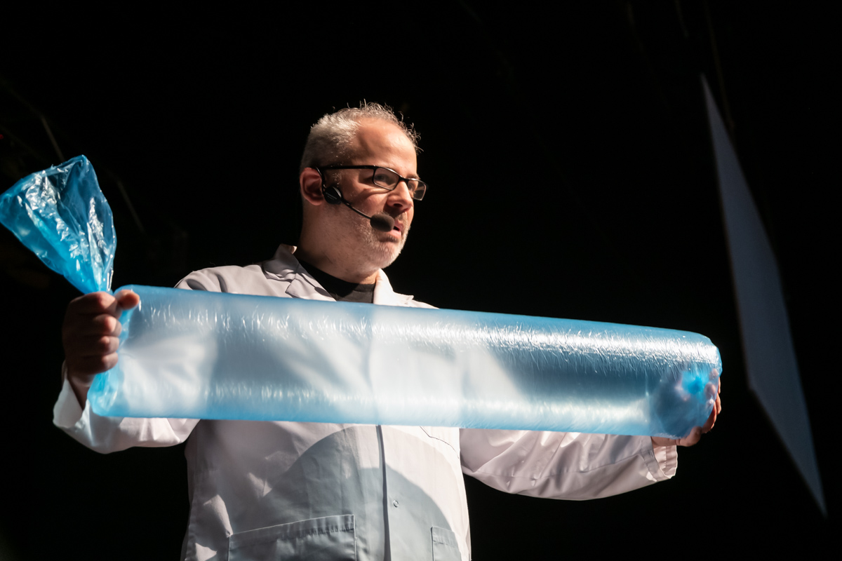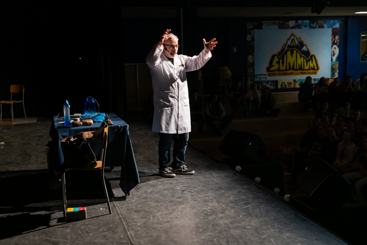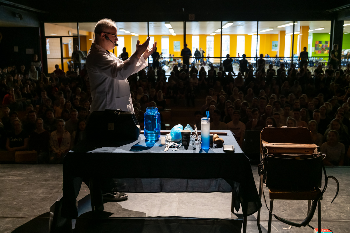 En tout, 650 élèves en ont appris davantage sur ce scientifique, sur ses expériences de travail et sur ses passions. Durant ses deux présentations, Dr. Carli a parlé de sa première audition qui a lui a permis de faire le saut à la télévision. Il a ensuite réalisé diverses expériences en faisant participer les élèves. Ils ont entre autres compris quel type de son sortira d’une paille à boire, combien de bouffées sont nécessaires pour remplir un sac de 1m de long, comment un chat retombe-t-il sur ses pattes, quelle est la meilleure façon de se sécher les mains : avec le séchoir ou avec du papier et combien de ml d’eau peut contenir une couche jetable.