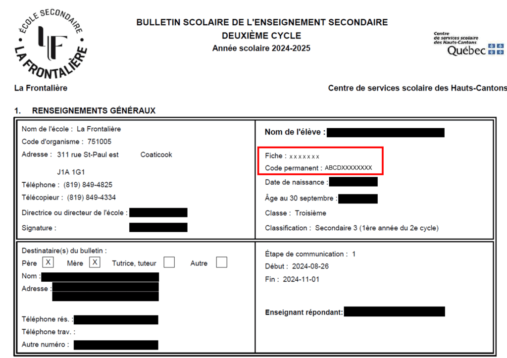Remplissez la section Renseignements sur l’identité comportant les informations suivantes : le courriel, le nom, prénom et date de naissance de votre jeune, ainsi que votre nom et prénom. Ayez en main également le code permanent et le numéro de dossier étudiant pour la section Renseignements scolaires. Notez bien que ces informations sont disponibles sur le bulletin scolaire (voir l’image ci-dessous). Pour toutes questions en lien avec le bulletin, veuillez contacter directement le secrétariat de l’école.