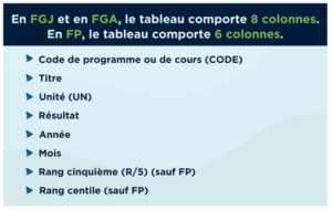 Tableau des résultats – formation générale des jeunes (FGJ), formation générale aux adultes (FGA) et formation professionnelle (FP)